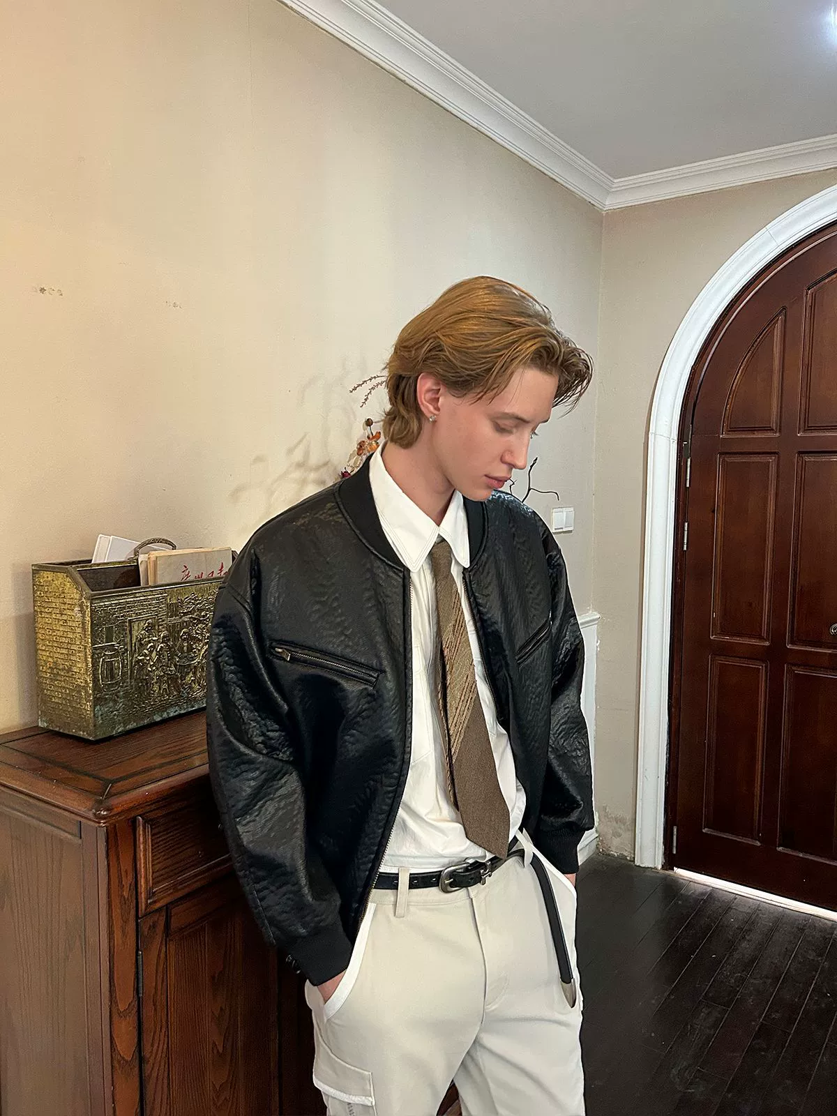 Modern retro pleated jacket short wide black baseball collar zipper winter jacket motorcycle top for men and women