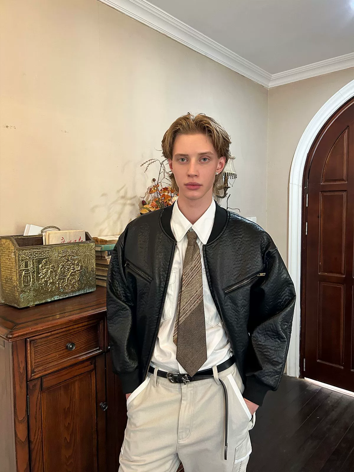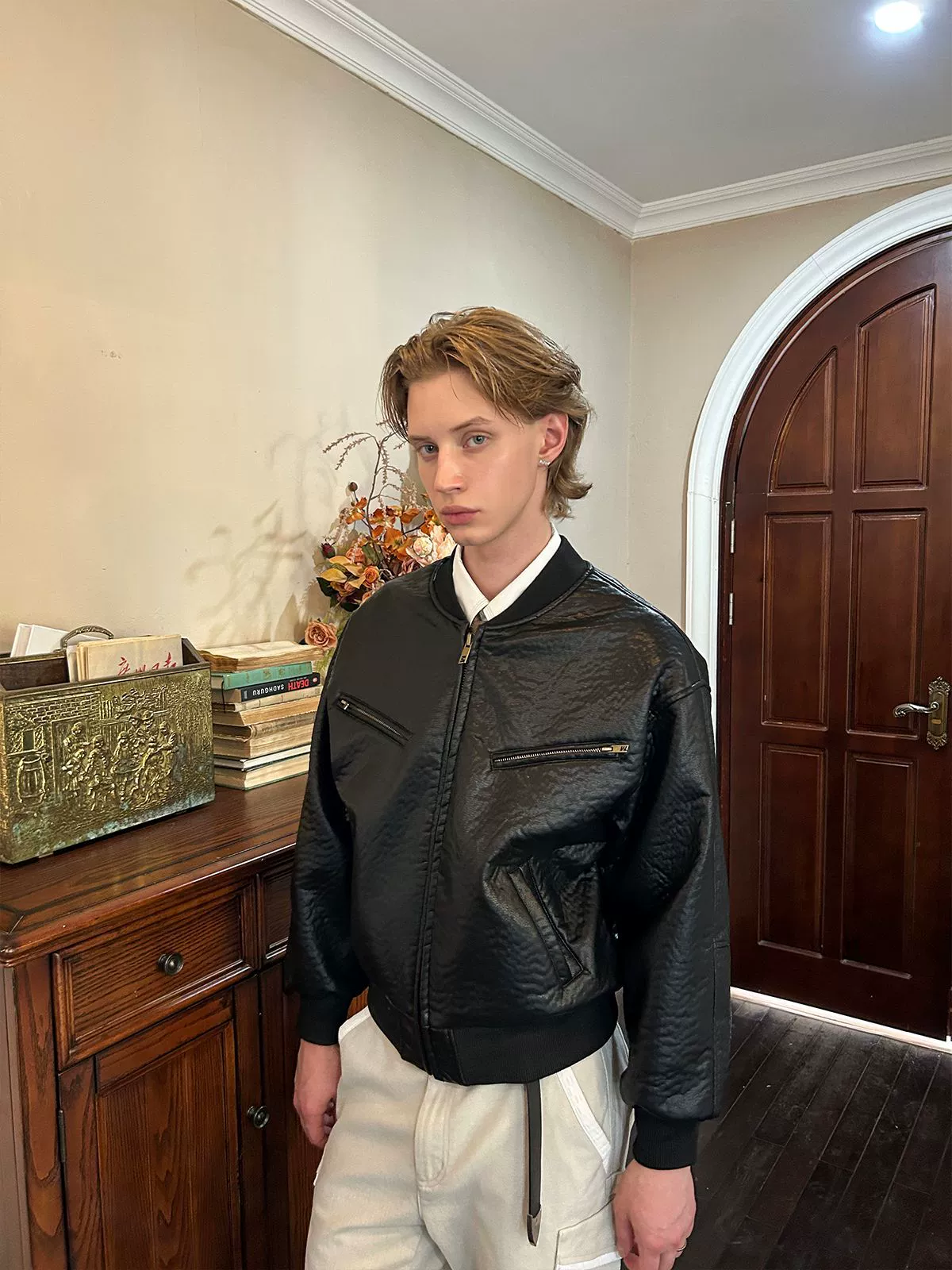 Modern retro pleated jacket short wide black baseball collar zipper winter jacket motorcycle top for men and women
